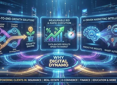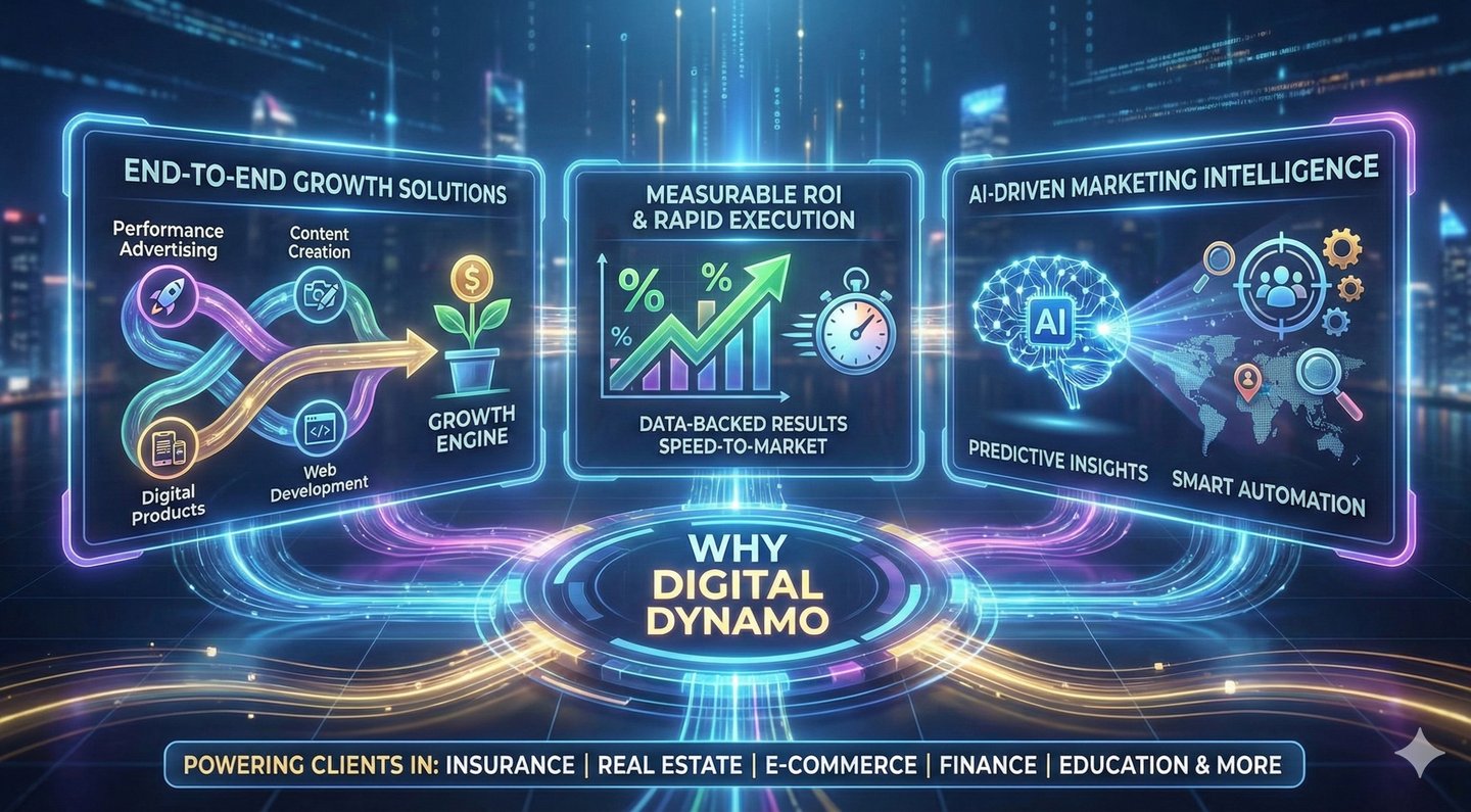 Digital Dynamo is a next-generation digital marketing and technology agency offering end-to-end growth solutions across performance advertising, content creation, digital products, and web development.With clients across insurance, real estate, e-commerce, finance, education, and more, we deliver measurable ROI, rapid execution, and AI-driven marketing intelligence.